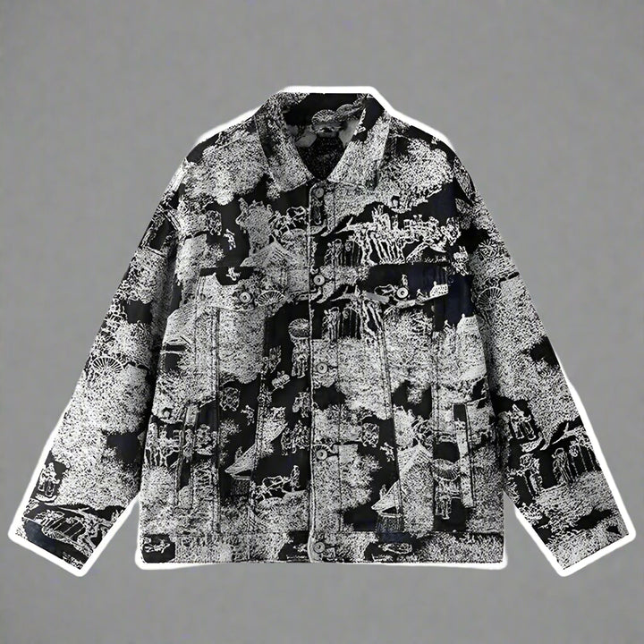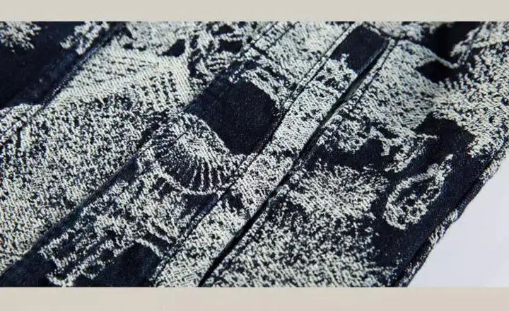 Inspired by Japan's fashion-forward culture, this jacket embodies a perfect balance of tradition and modernity. The Jacquard Retro Denim Jacket offers a fresh take on streetwear with its distinct embroidered designs, creating a fusion of retro and contemporary vibes. Its loose fit and ribbed sleeve cuffs add to the relaxed, casual feel, making it versatile enough to be worn with a variety of outfits, from casual jeans to more fashionable, layered looks. The jacket is an ideal choice for those who enjoy unique, globally inspired fashion.